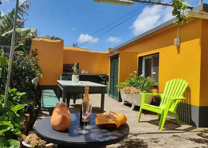 Casa Amarela De Santana توفر إقامة جيدة لـ6 ضيوف في مدينة هيبيرا غْريندي. الملكية تتضمن الشرفة والمطبخ الصغير وأريكة في الغرف.